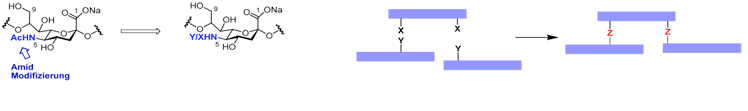 Auf der Basis von Huisgen´s 2+3 dipolarer Cycloaddition – auch bekannt als "click"-Chemie – werden diverse unterschiedliche Modifikations-Strategien verfolgt, die durch den Erhalt der Erkennungsdomänen der Endosialidase eine höchstmögliche enzymatische Abbaubarkeit sicherstellen.